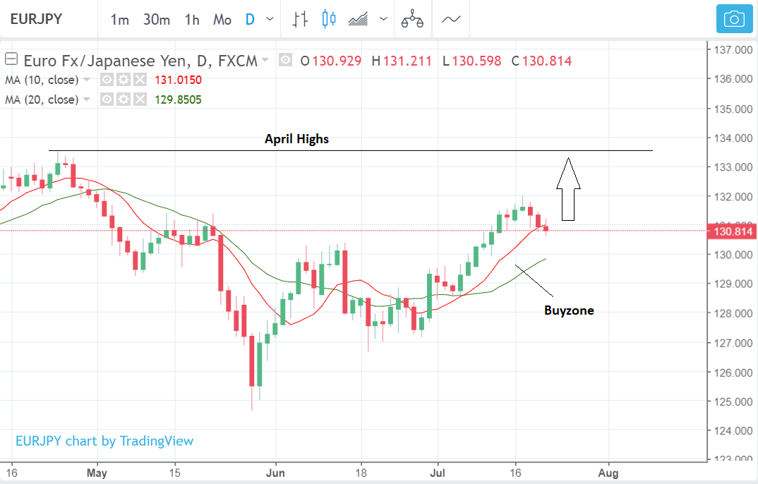 EUR/JPY has pulled back into what traders call 'the buyzone' on daily charts, which is the space between the 10 and 20 moving averages (MAs), which many traders see as the optimum time to buy in the middle of an up-trending market.