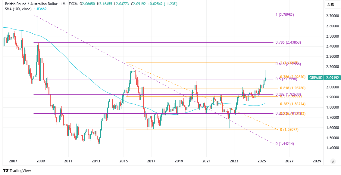 Above: GBP/AUD shown at monthly intervals with Fibonacci retracements indicating major long-term resistance levels. Click for closer inspection.