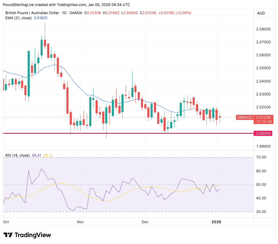 The pound to Australian dollar exchange rate (GBP/AUD) is softer on Monday at 2.0126, but losses are relatively shallow and price action speaks of the becalmed conditions in this market.
