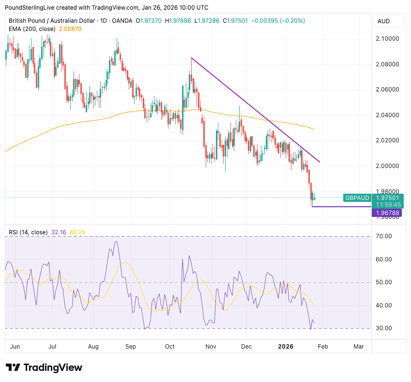 GBP/AUD dropped to a new 11-month low at 1.9678 on Friday after the latest pulse in a strong across-the-board AUD rally.