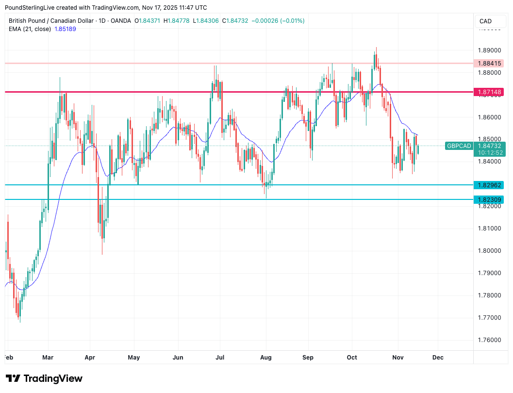 This should offer CAD some support via the rates channel going forward and lessen the odds of GBP/CAD recapturing 2025's highs at 1.8840.