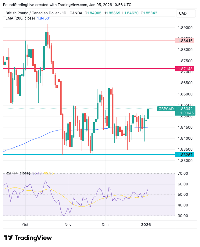 The pound to Canadian dollar (GBP/CAD) rises to 1.8523 on Monday, which keeps it well within the range it has occupied since November.