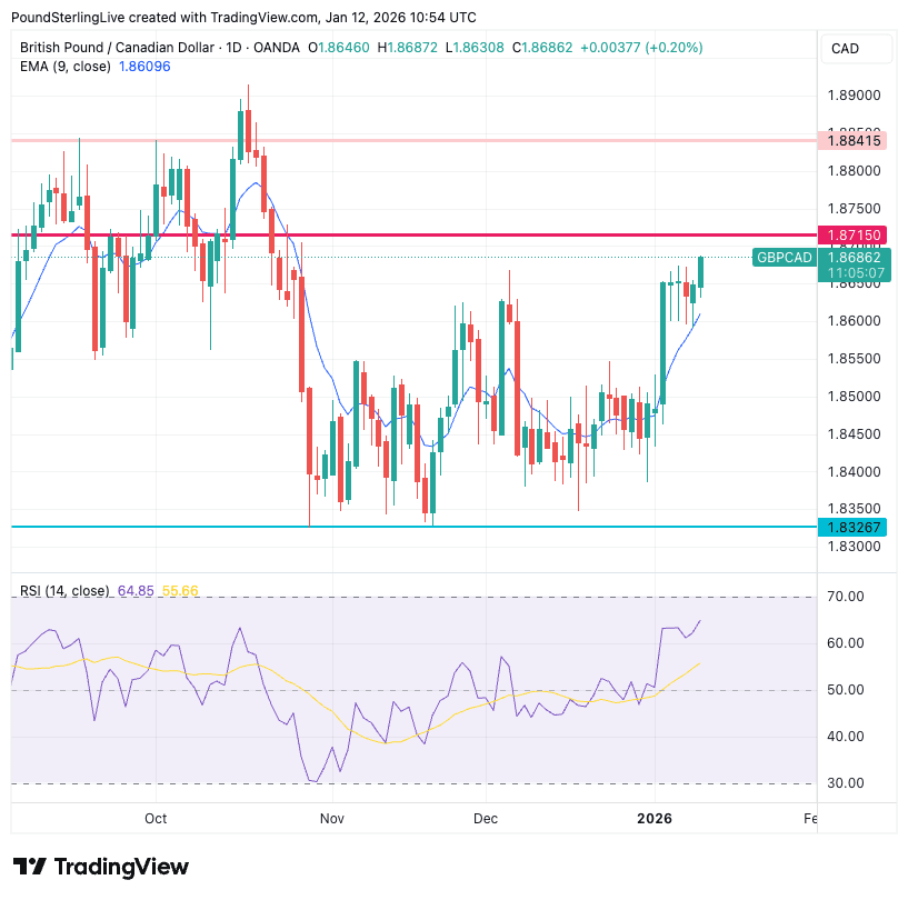 The pound to Canadian dollar exchange rate (GBP/CAD) rises to its highest level since late October on Monday at 1.8689.