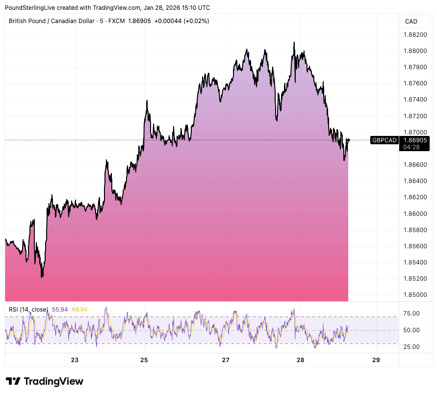 The pound to Canadian dollar exchange rate (GBP/CAD) is 0.60% lower on the day at 1.8689, having been as high as 1.8818 on Tuesday.