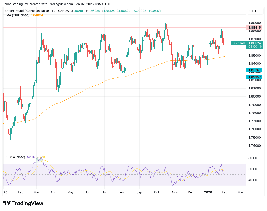 GBP/CAD remains above its 200-day exponential moving average (EMA), and while price holds above this level the broader bias is likely to remain upward.