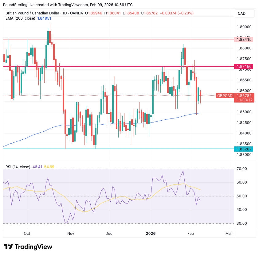 The pound to Canadian dollar exchange rate slipped to 1.8570 on Monday after retreating for a second consecutive week, unwinding earlier gains without signalling a decisive shift in trend.
