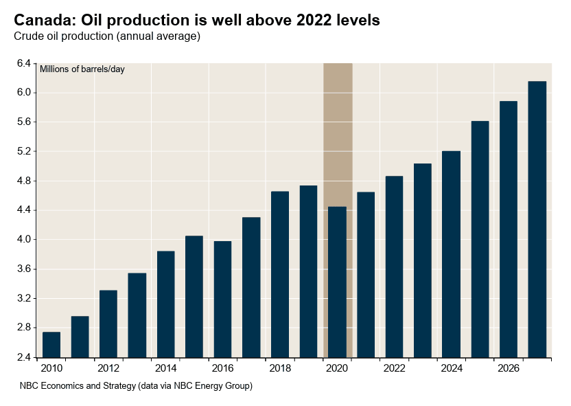 NBF also notes that Canada's oil production continues to expand, amplifying the positive impact of higher prices. "Crude oil production is expected to reach 5.8 mb/d in 2026, up 18% from the 4.9 mb/d recorded in 2022."