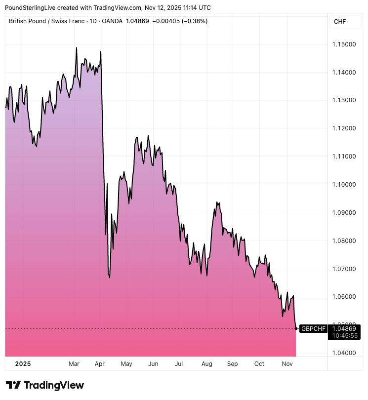 The pound is now below 1.06 against the Swiss franc on Tuesday, with analysts at Société Générale saying the move could extend as weaker UK employment data and improving Swiss fundamentals tilt the balance in favour of the franc.