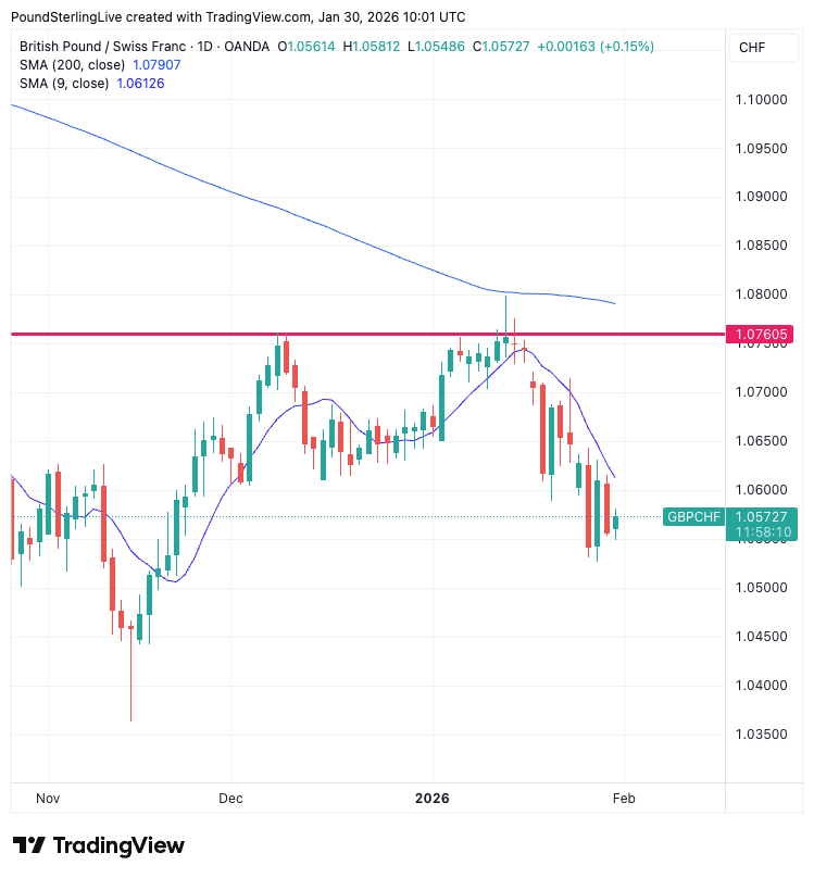 GBP/CHF peaked at 1.0798 on January 14, a move that brought the pair into contact with a descending 200-day moving average that has defined the broader downtrend.