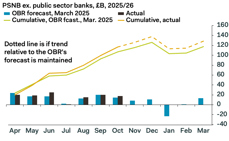 "October borrowing illustrates the difficult backdrop to the upcoming Budget. Borrowing has now overshot the fiscal watchdog’s projections in four of the seven months," says Elliott Jordan-Doak, Senior U.K. Economist at Pantheon Macroeconomics.