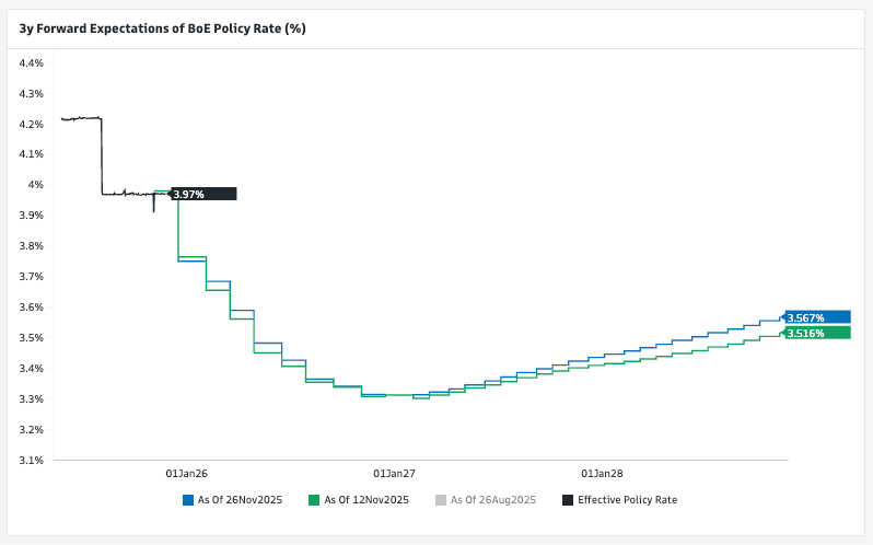 Above: Market implied expectations for the future of the Bank of England's Bank Rate. There are three further cuts priced in.