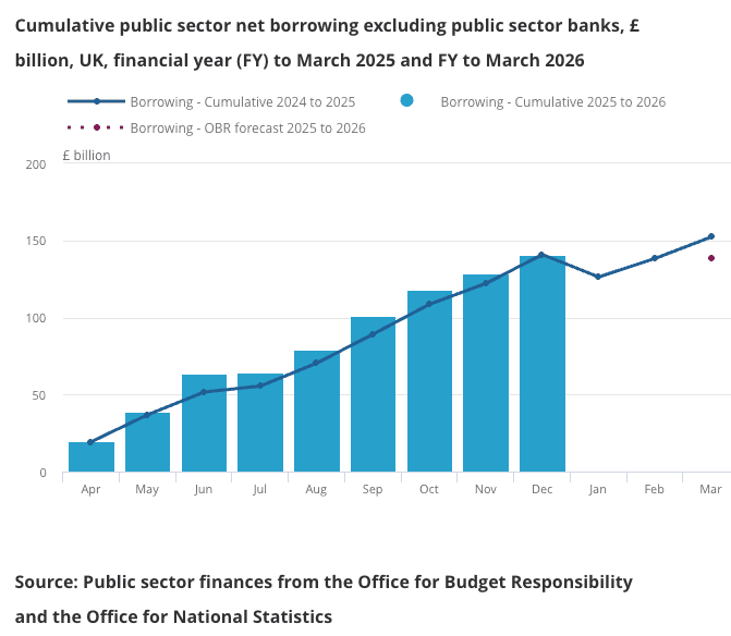 Public sector net borrowing was £11.6BN in December said the ONS Thursday, down on December 2024’s figure of £18.7BN. The consensus looked for a reading of £13BN.