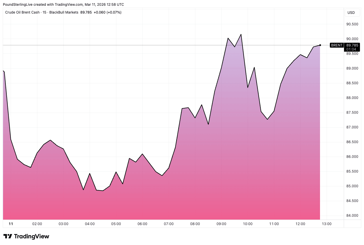 Brent crude is higher 3.8% on the day at $90 / barrel, European month-ahead gas is 3% higher at €49/kwh.