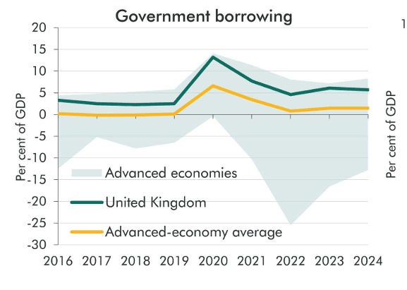 "Efforts to put the UK's public finances on a sustainable footing after a series of global shocks have met with only limited and temporary success in recent years, leaving the UK with the sixth-highest debt, fifth-highest deficit, and third-highest borrowing costs among 36 advanced economies."