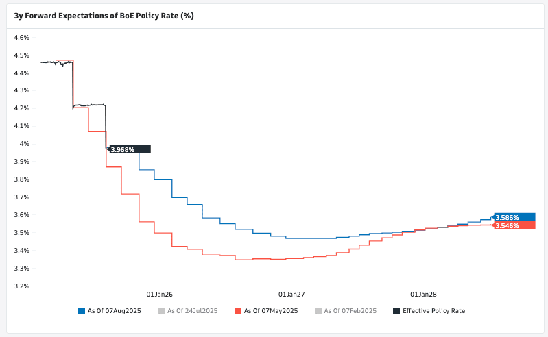 "This is based on our forecast for further deterioration in the labour market. The risks are skewed towards a slower, quarterly pace. We see the bank rate ending next year at 2.75%, which we see as broadly neutral. At the time of writing, financial markets are pricing only a 70% probability of 25bp cut in the remainder of this year, and only 40bp of cuts by the end of next year, to 3.6%," says UniCredit.