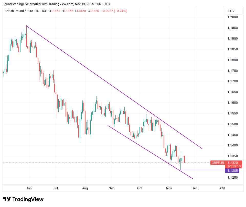 Above: GBP/EUR is trending in a downside channel.