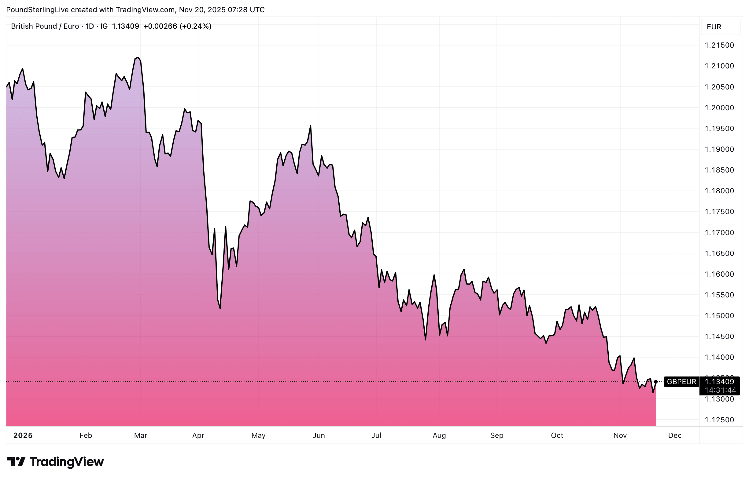 Year-end consensus forecasts compiled by Pound Sterling Live suggest that although institutional sentiment toward GBP/EUR has softened since mid-year, the pair now screens as undervalued and potentially primed for a relief rebound after the Budget.