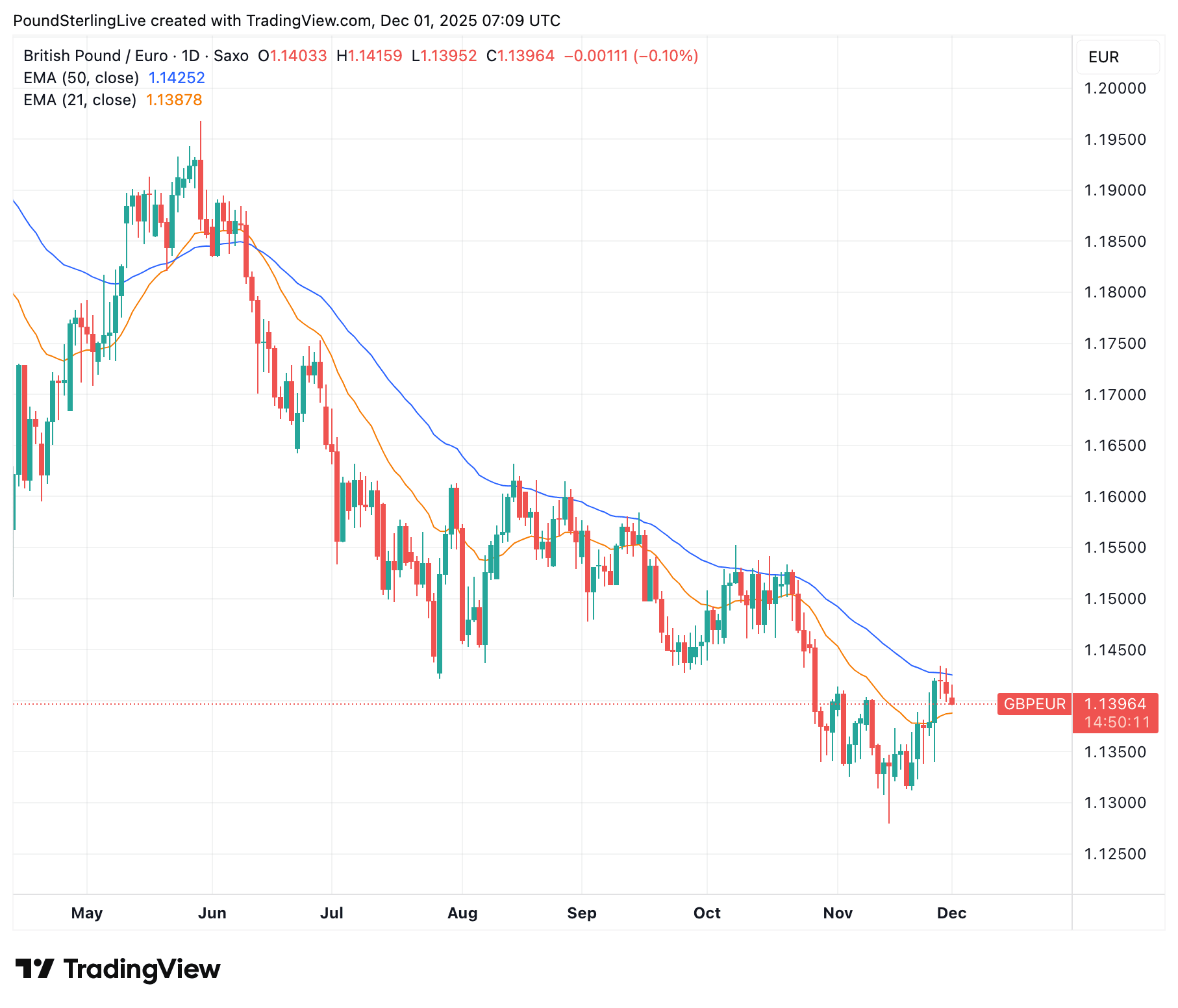 The pound to euro exchange rate (GBP/EUR) rose a third of a per cent last week and opens the final month of the year at 1.1407.