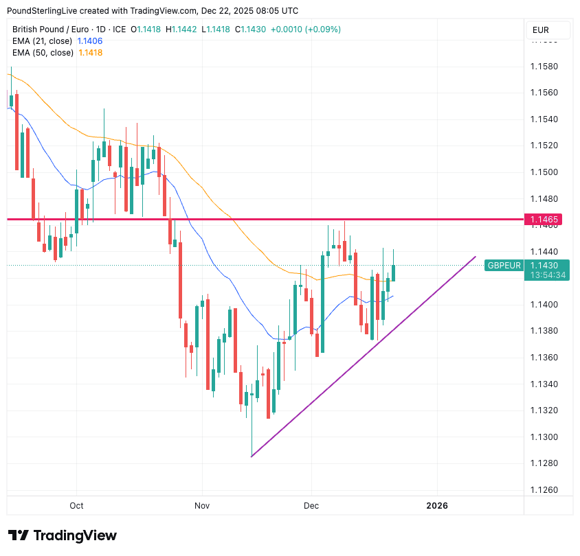 The pound to euro exchange rate (GBP/EUR) has been ascendant since mid-November, and this Week Ahead Forecast looks for that uptrend to hold court in the coming days.