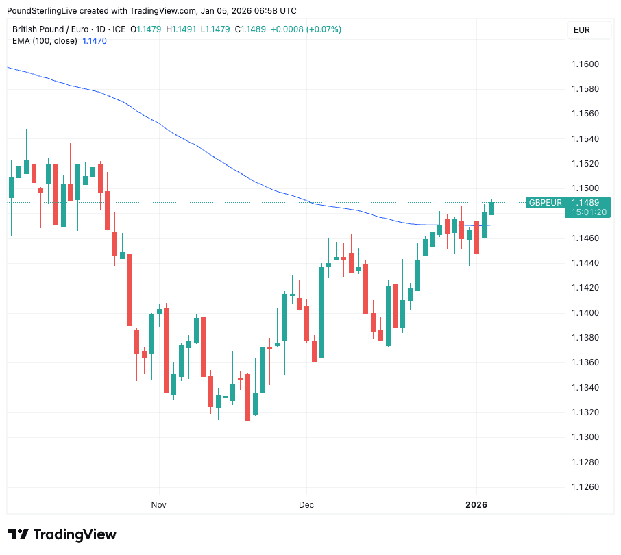 The new two-month peak follows the Christmas period of consolidation that saw GBP/EUR struggle to advance above the 100-day exponential moving average (EMA), presently located at 1.1470.