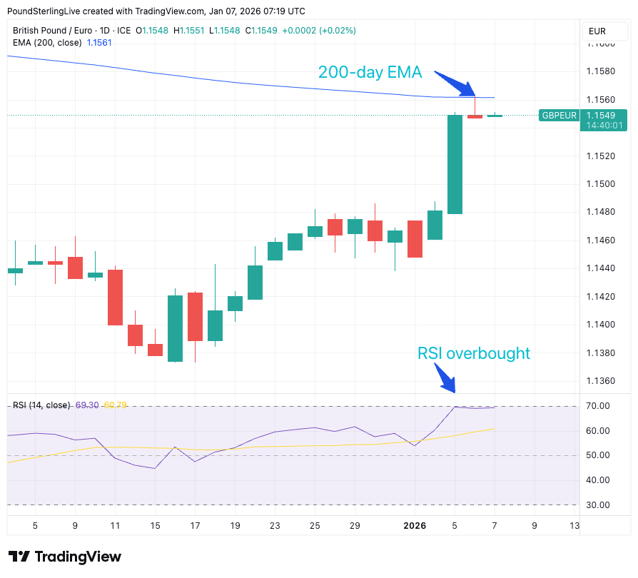The pound to euro exchange rate's advance took it to a high of 1.1560 on Tuesday, where it promptly butted heads with the 200-day exponential moving average (EMA) and halted.