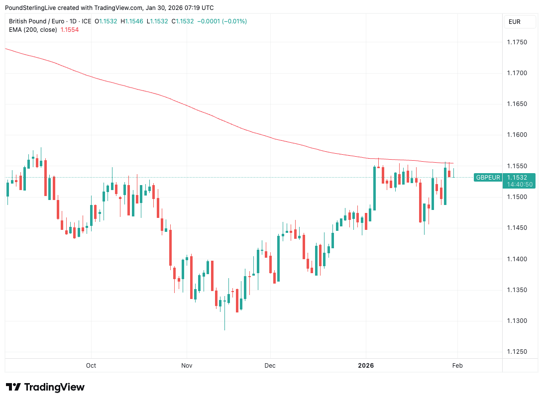 A decisive close above the 200-day EMA would likely force a reassessment of positioning, opening the door to a more sustained recovery in the pound against the euro.