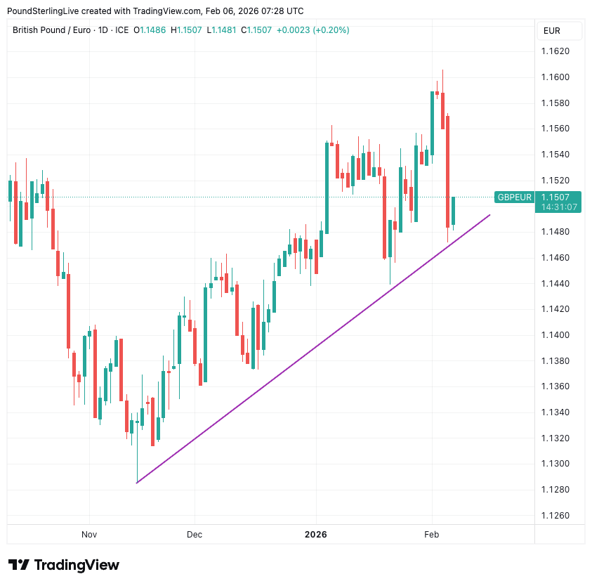 Above: GBP/EUR drops, but EUR buyers will take hope that it's still defending its uptrend line.