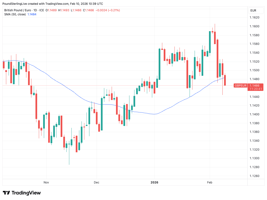 Above: GBP/EUR breaks below the 50-day simple moving average, a potentially significant technical development that augurs for further losses.