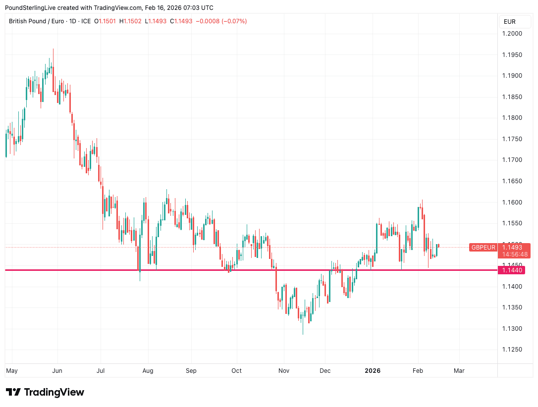 This line has acted as a fulcrum for the broader sideways GBP/EUR range that has played out since July 2025