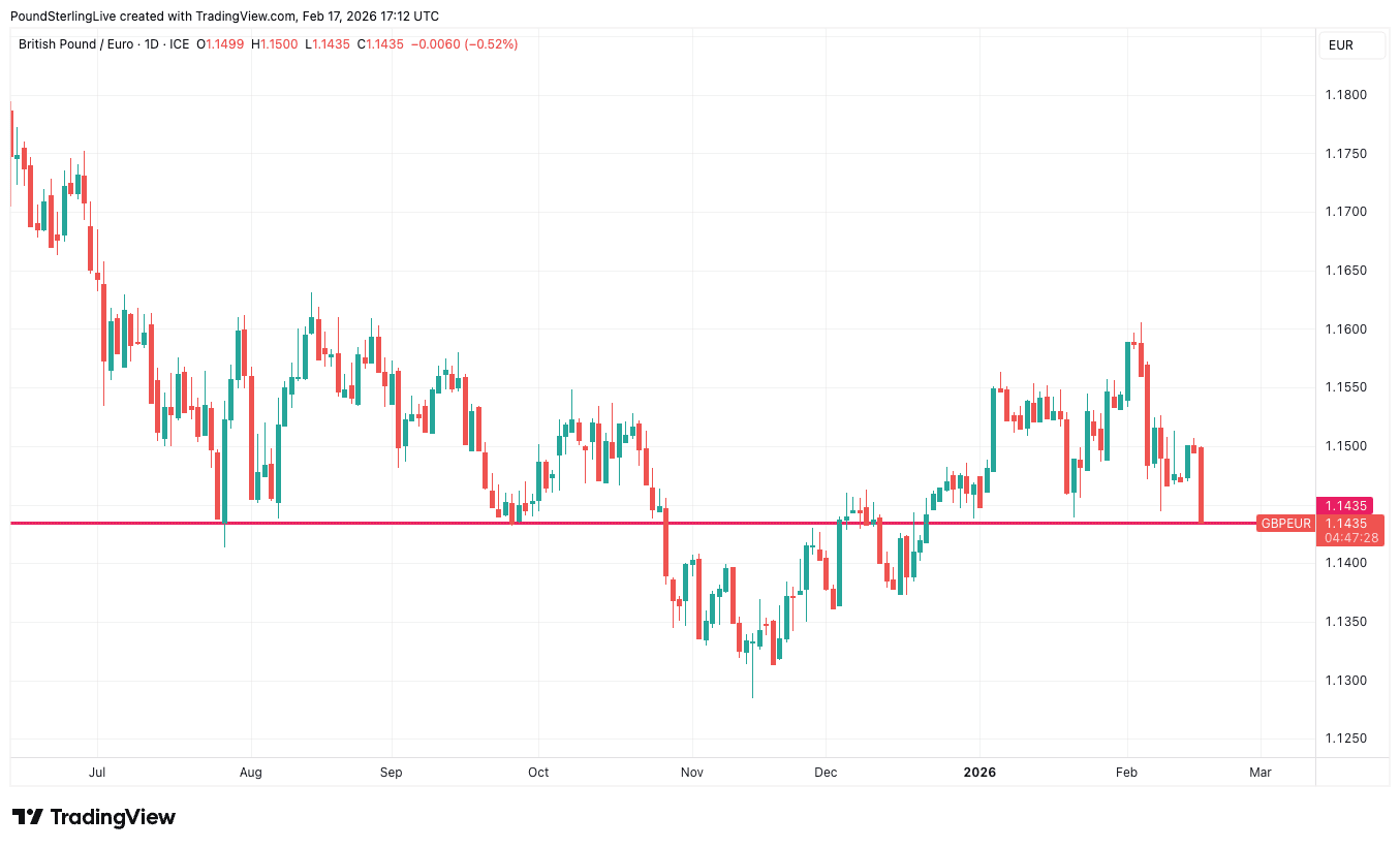 Pound to euro exchange rate falls to 1.1435, the lowest level of the year, after a soft set of labour market data that bolstered bets the Bank of England will raise interest rates in March.