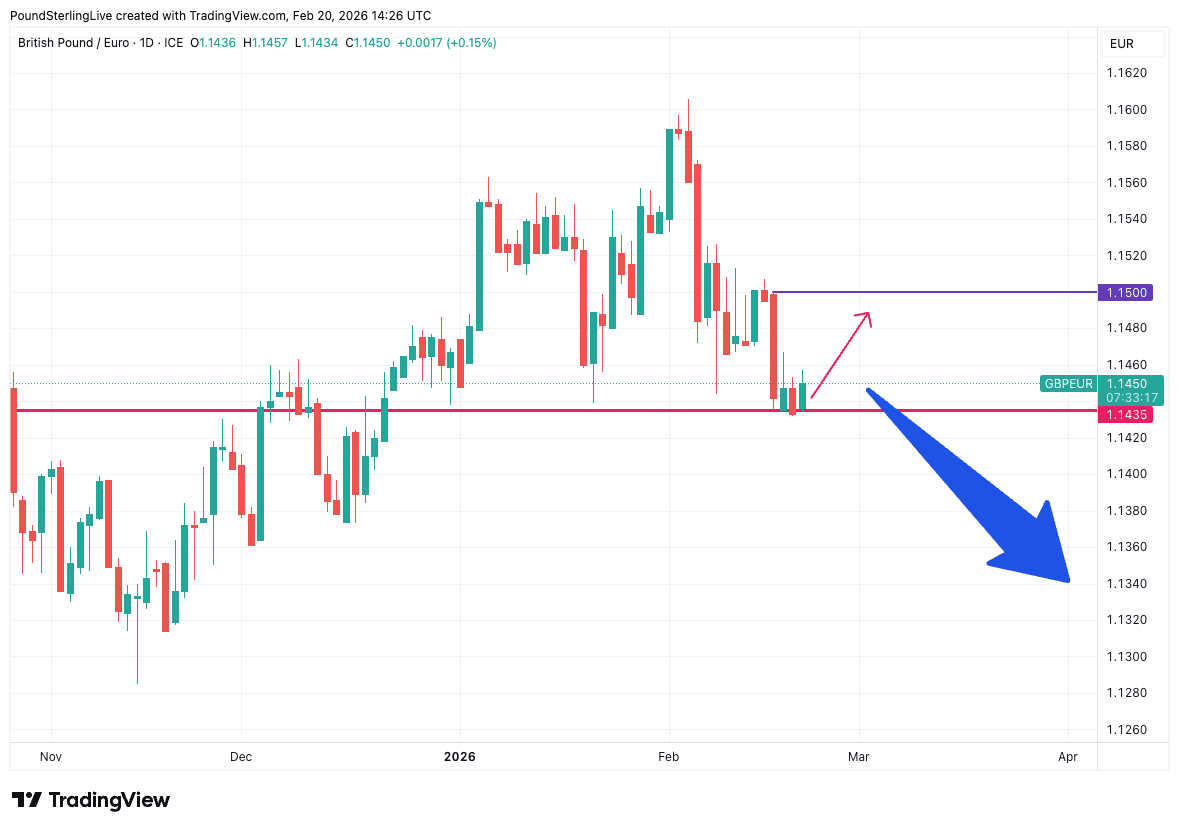 The pound to euro exchange rate (GBP/EUR) rises to 1.1450 ahead of the weekend, setting up a potential advance in the coming week.