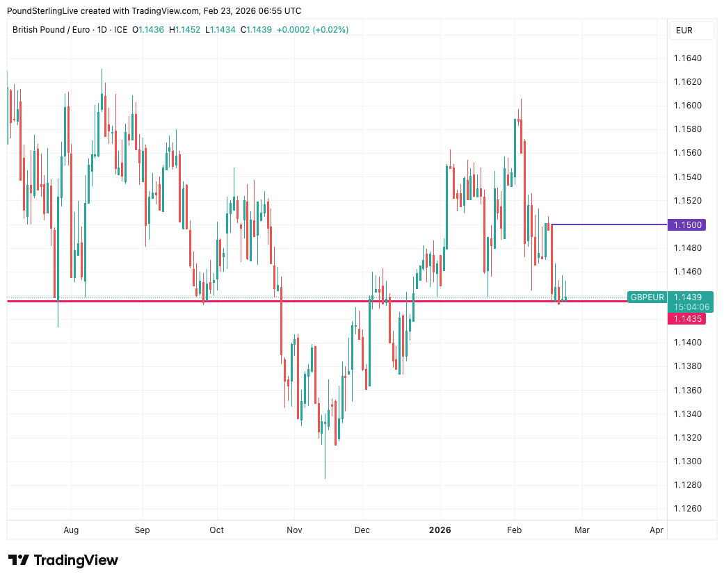 The pound to euro exchange rate (GBP/EUR) trades at 1.1435 at the time of writing on Monday, putting it right on top of a horizontal support structure that we have been watching for some time.
