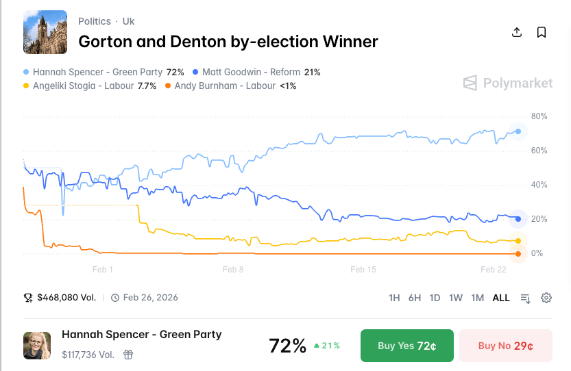 Above: Polymarket suggests the Greens are likely to take the seat from Labour.