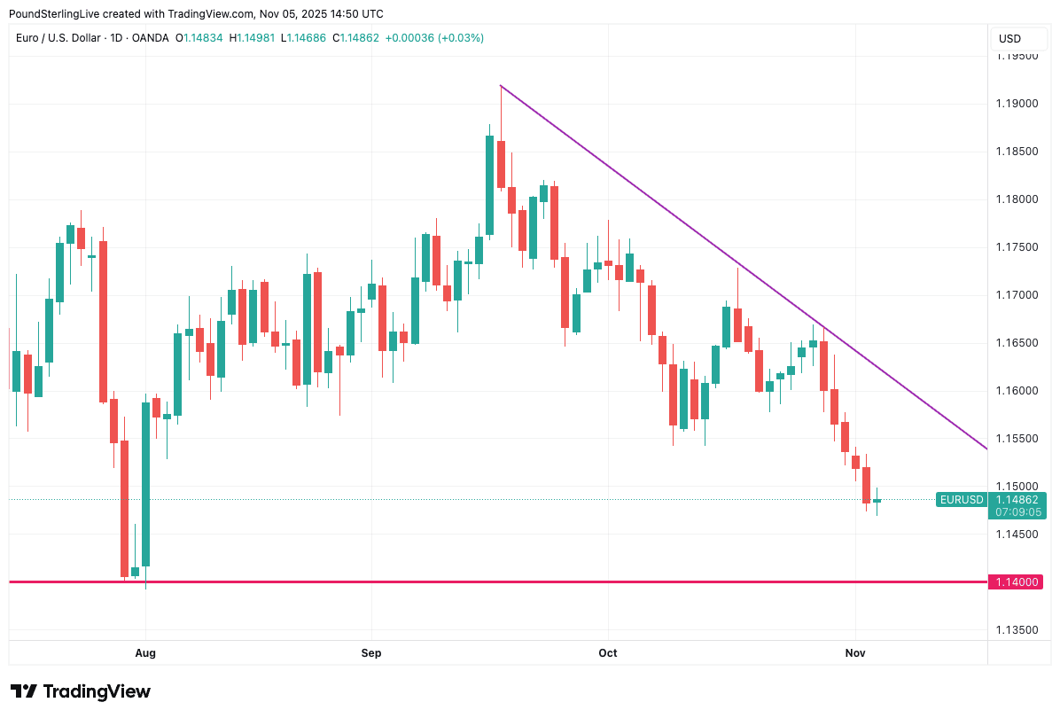 "Technically, EUR/USD remains stuck in a well-defined bearish channel that began after peaking near 1.0920 in September. The August low at 1.1390 now represents a critical line in the sand. So long as that level holds, the pair avoids confirming a deeper downtrend," says Razaqzada.