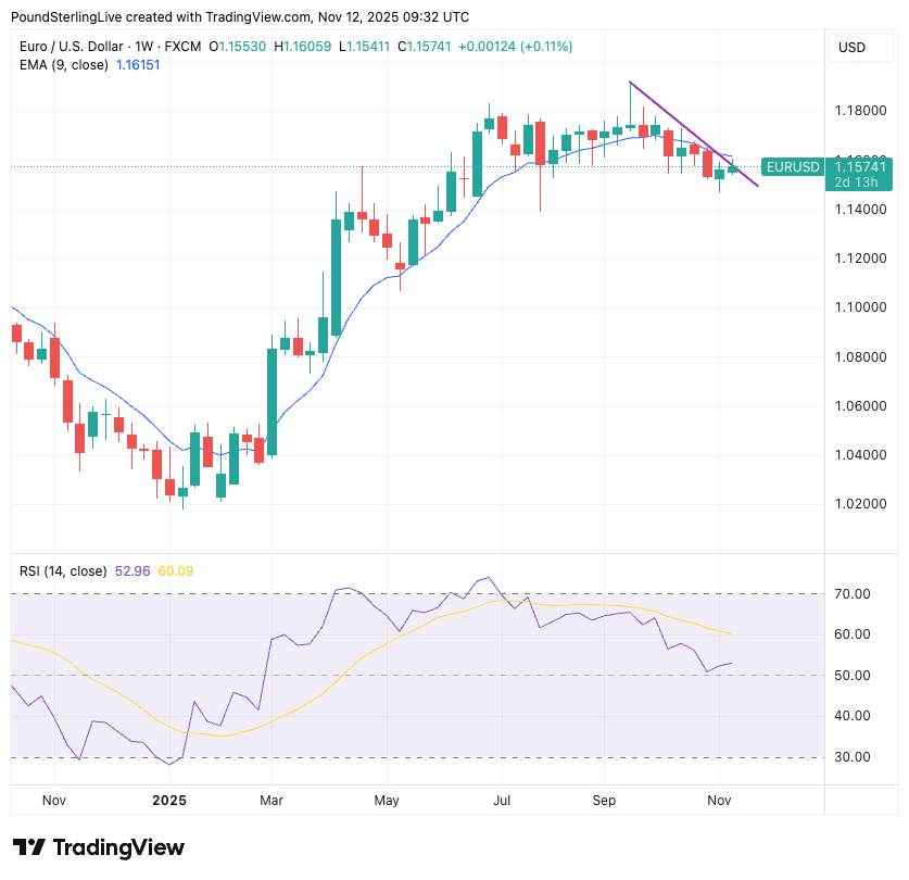 The chart shows the pair is now capped by the nine-week exponential moving average (EMA), currently at 1.1615, which tells us the softness is set to stay with us for a while longer.
