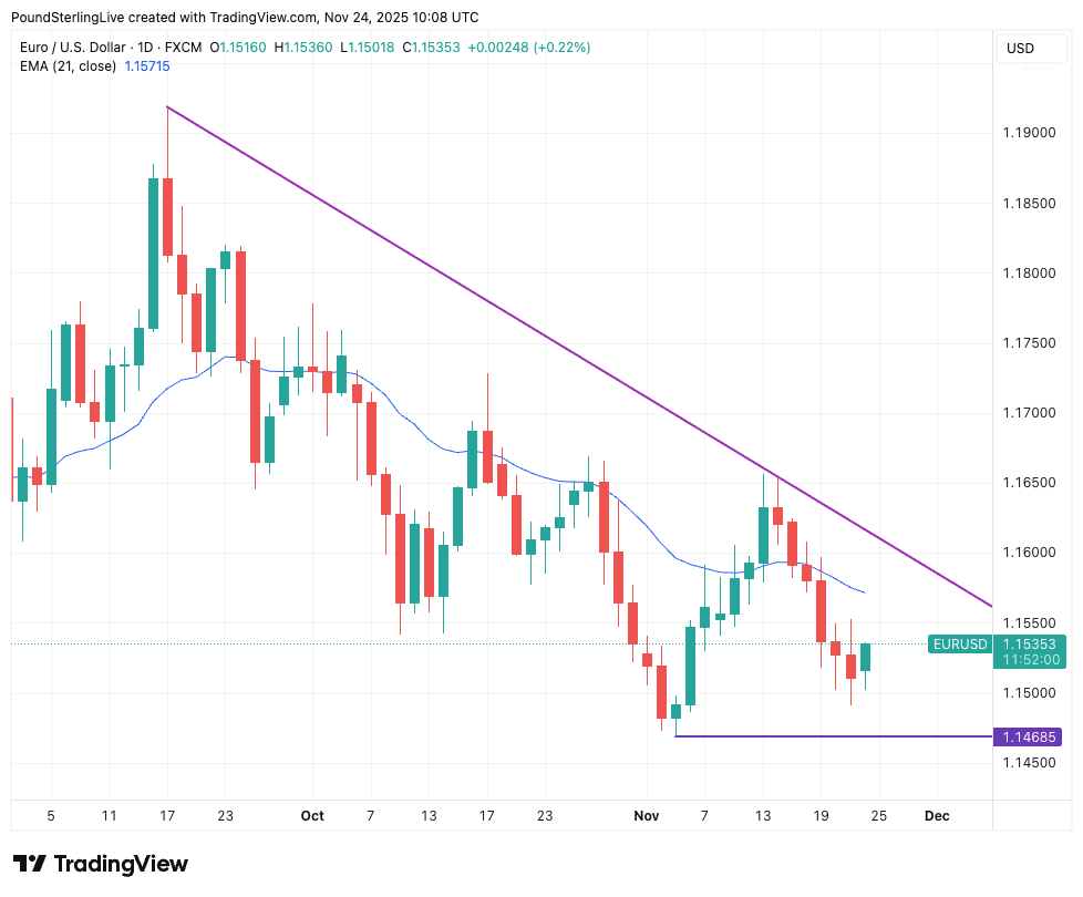 With the market still seeing a near-50% odds of a cut, there's ample scope for pricing to continue to move against a December move. If this week's U.S. dollar encourages this to happen, then euro-dollar will stay under pressure.