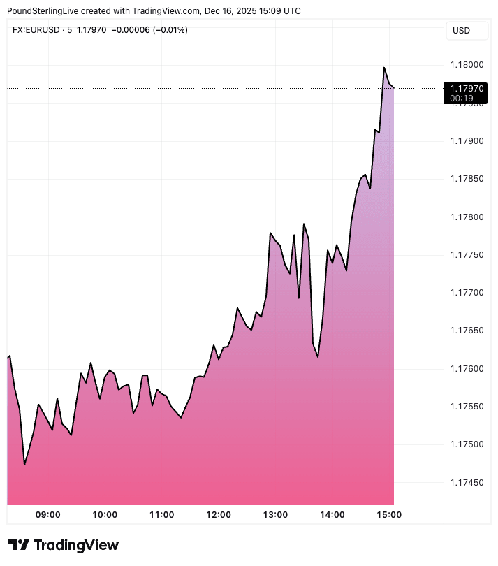 The euro to dollar exchange rate (EUR/USD) is closing in on 1.18.