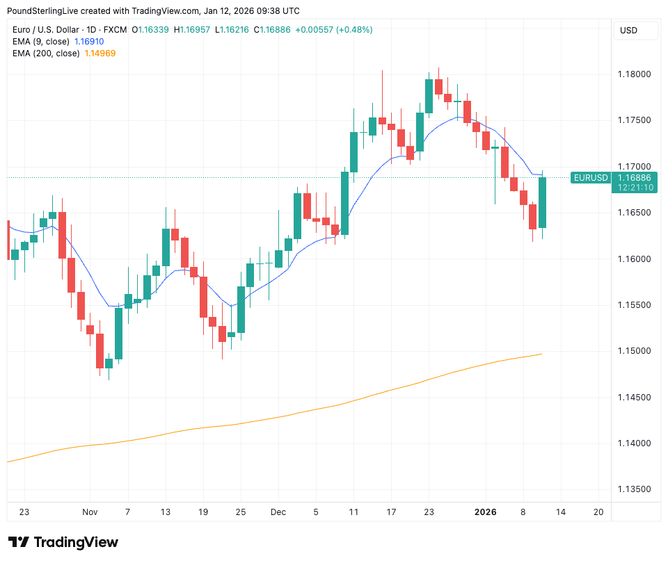 The pair had fallen to a low of 1.1618 after 11 uninterrupted days of decline, but Monday sees a solid 0.50% gain to 1.1692, courtesy of Trump's latest moves.