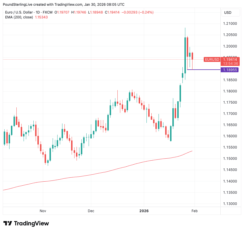 EUR/USD was trading around 1.1940 on Friday after earlier touching 1.1895, a level that has acted as interim support over the past three sessions.