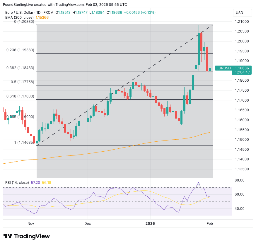 We forecast that the retracement peters out from here and that the euro retains support around 1.1850, which is the 38.2% Fibonacci retracement of the November to January rally at 1.1850.