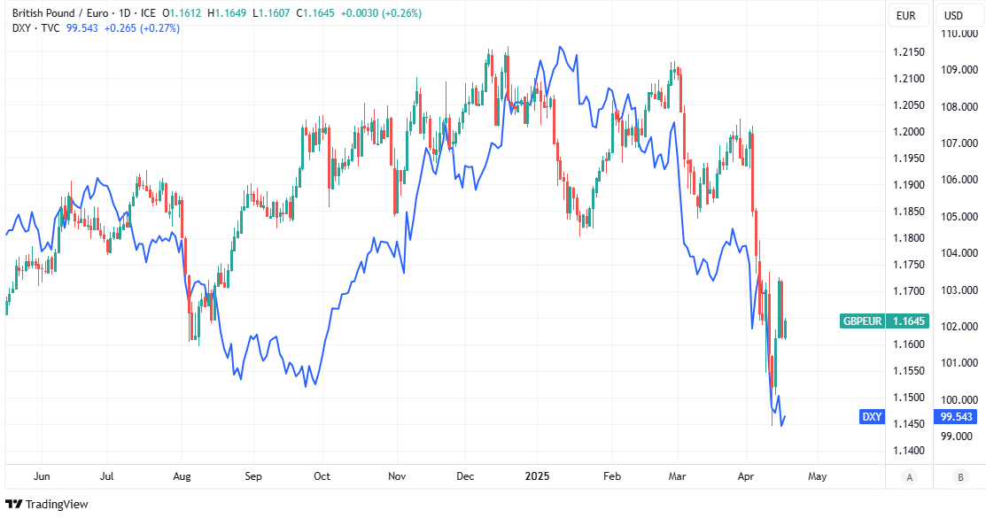 Above: GBP/EUR at daily intervals with ICE US Dollar Index. Click for closer inspection.