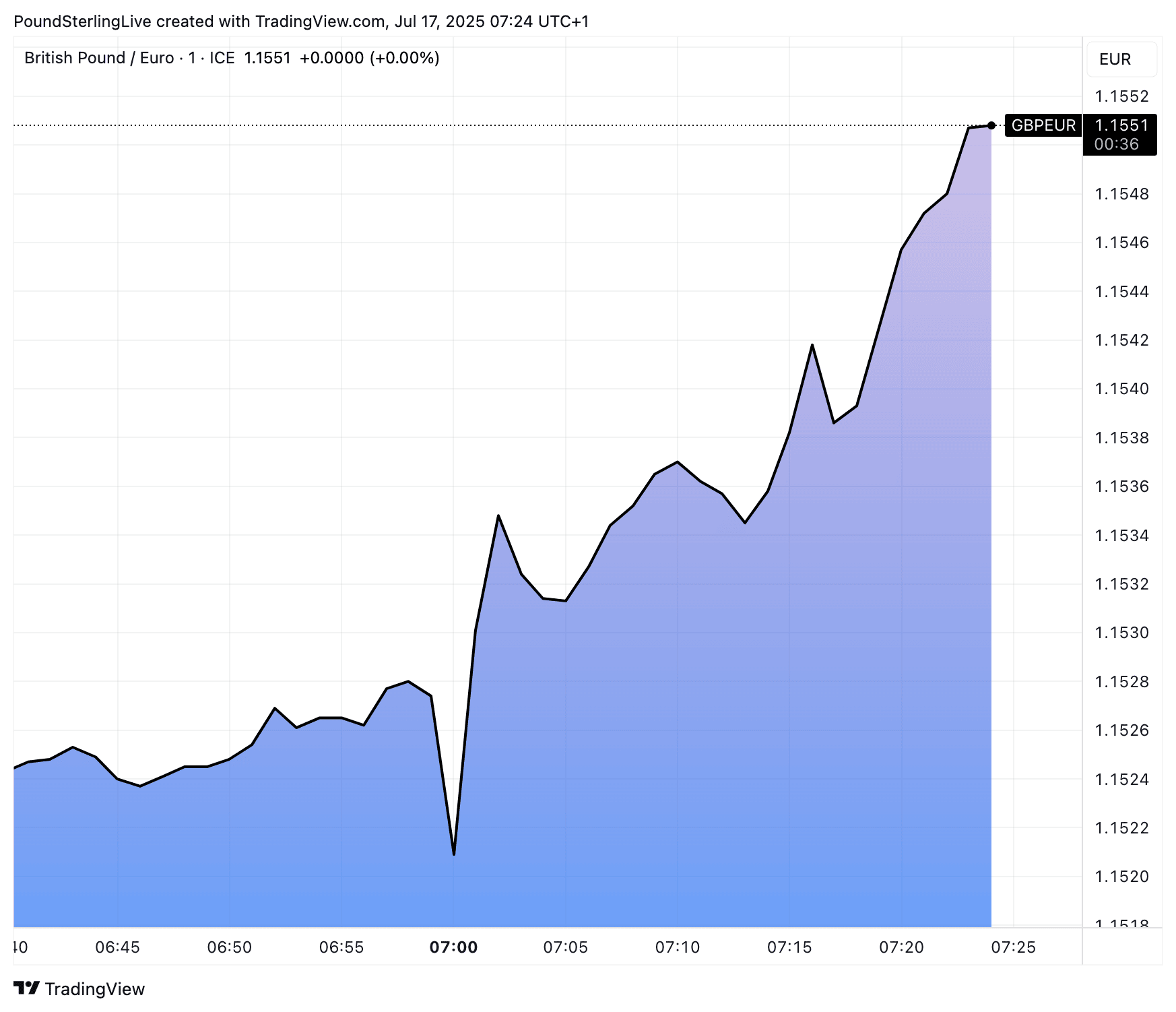 The ONS said unemployment rose again in June, however, a strong wages print helped Pound Sterling gain against the Euro, Dollar and other major currencies: The Pound to Euro conversion edged higher to 1.1536, the Pound to Dollar pair lifted to 1.3402.
