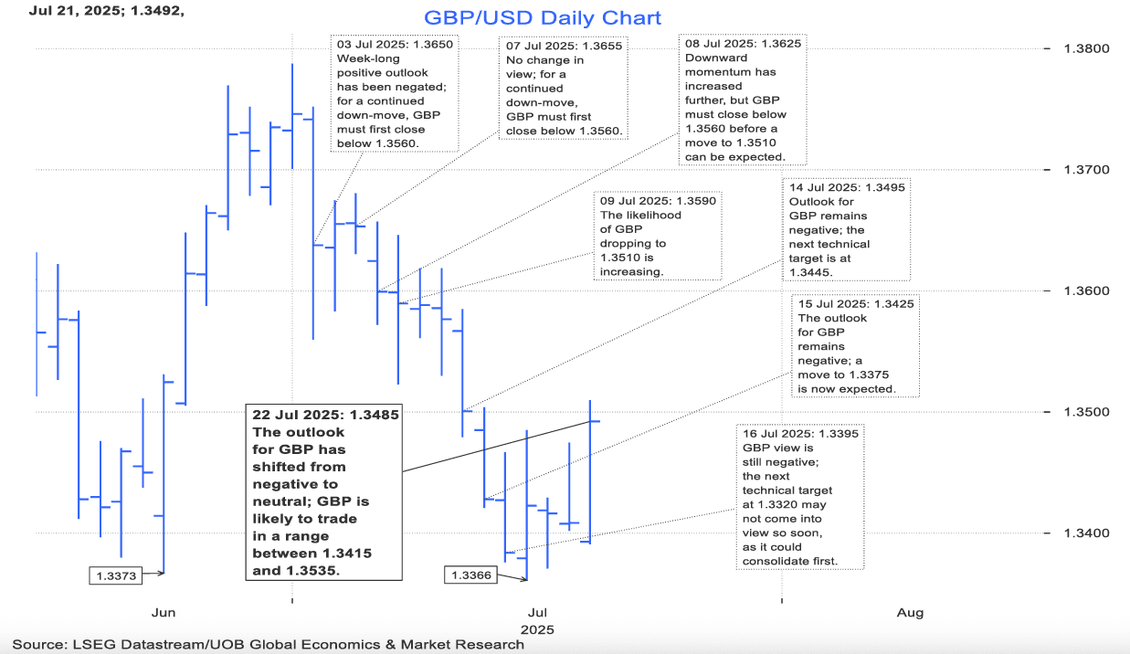 "GBP soared yesterday and broke above our ‘strong resistance’ level at 1.3490. The breach of the ‘strong resistance’ indicates that the outlook for GBP has shifted from negative to neutral. From here, GBP is likely to trade in a range between 1.3415 and 1.3535. Given the buildup in short-term momentum, the risk of GBP breaking above 1.3535 is higher, potentially paving the way for a more sustained advance."