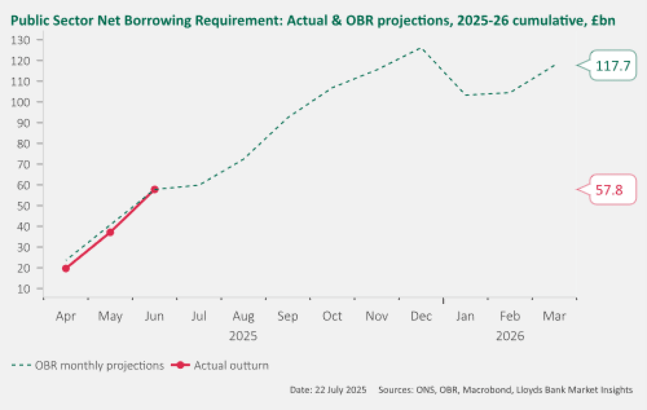 "Whilst this outturn was more than £3bn above market expectations, when looking cumulatively at the deficit for the first quarter of the 2025-26 fiscal year, borrowing of £57.8bn is right in line with the Office for Budget Responsibility’s monthly profile," says Sam Hill, Head of Market Insights at Lloyds Bank.