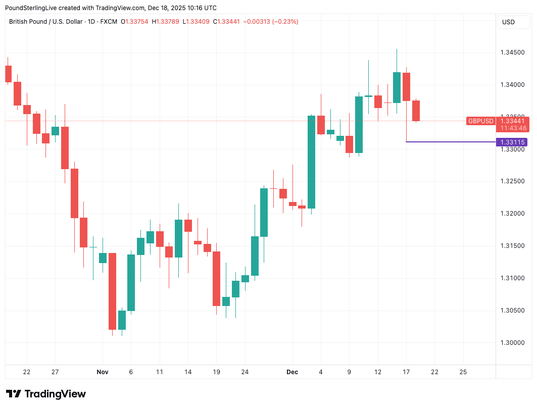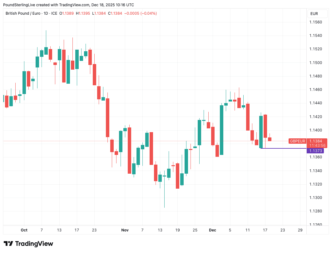 Above: GBP/EUR is off yesterday's lows, confirming resilience into year-end despite interest rate headwinds.