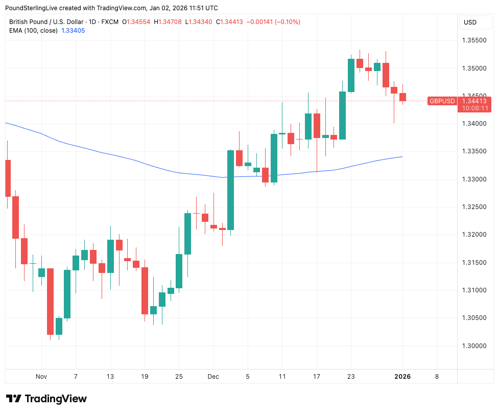 📉 The pound to dollar exchange rate eases back to 1.3434, having been as high as 1.3530 ahead of New Year's Eve.