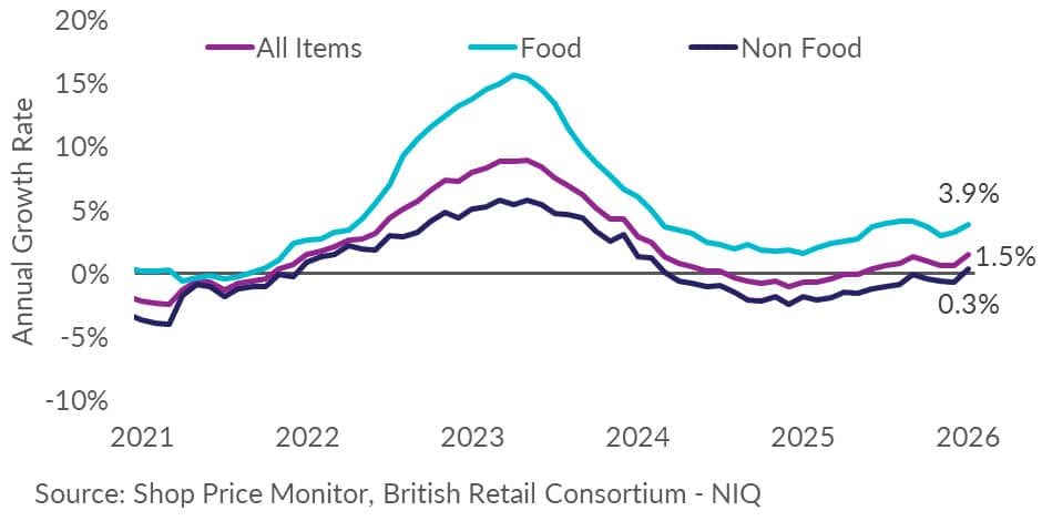 The British Retail Consortium (BRC) reports Tuesday that "rising inflation defies expectations" after shop price inflation increased to 1.5% year on year in January, up from 0.7% in December and above the 3-month average of 0.9%.