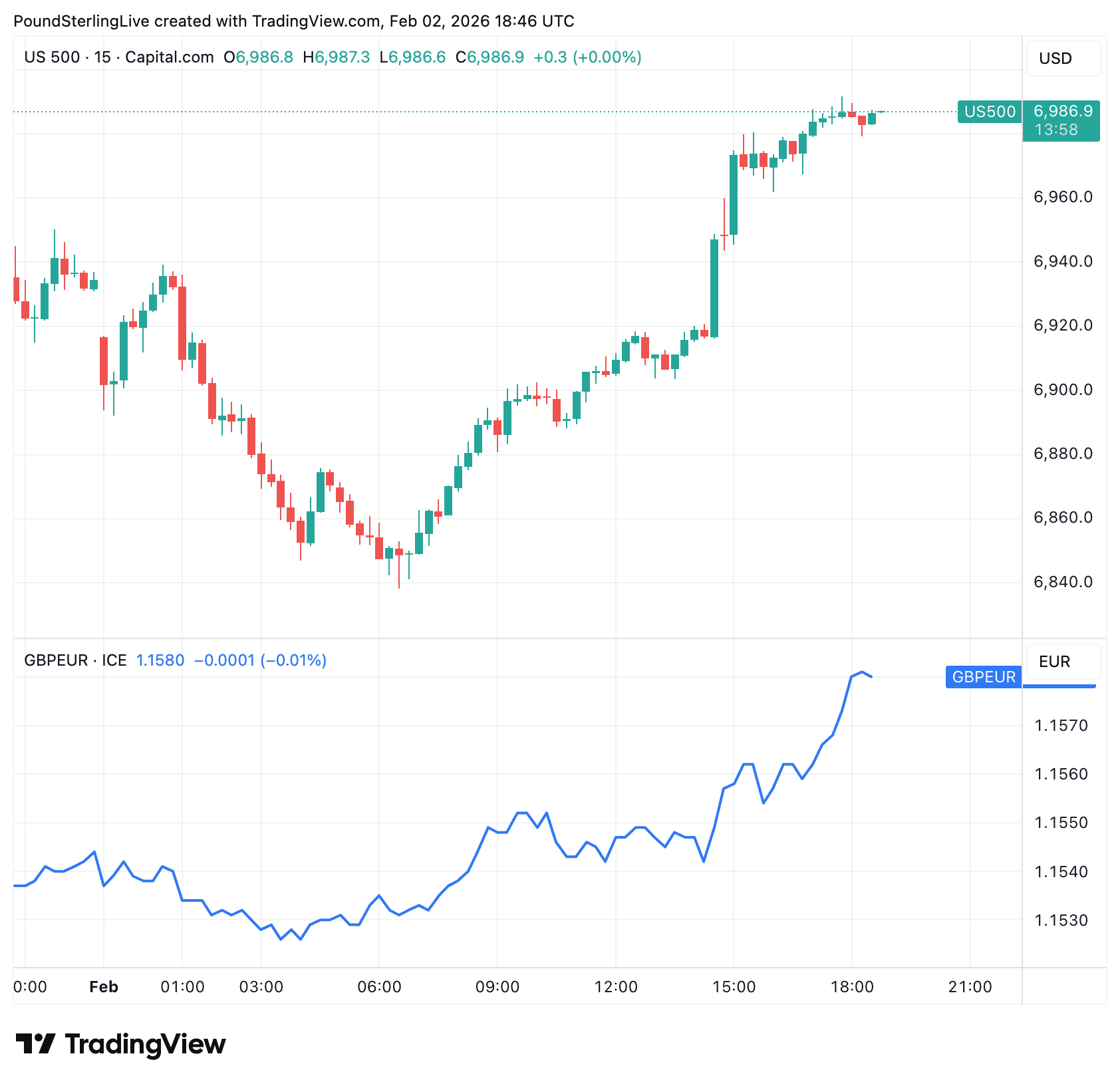 Above: The S&P 500 rises, taking GBP/EUR (lower panel) higher.