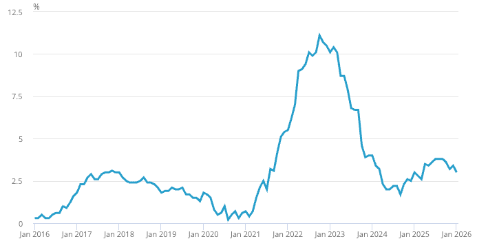 This was down from 3.4% in December and in line with the consensus expectation. The fall follows a -0.5% month on month reading in January, down sharply from the 0.4% increase of December.