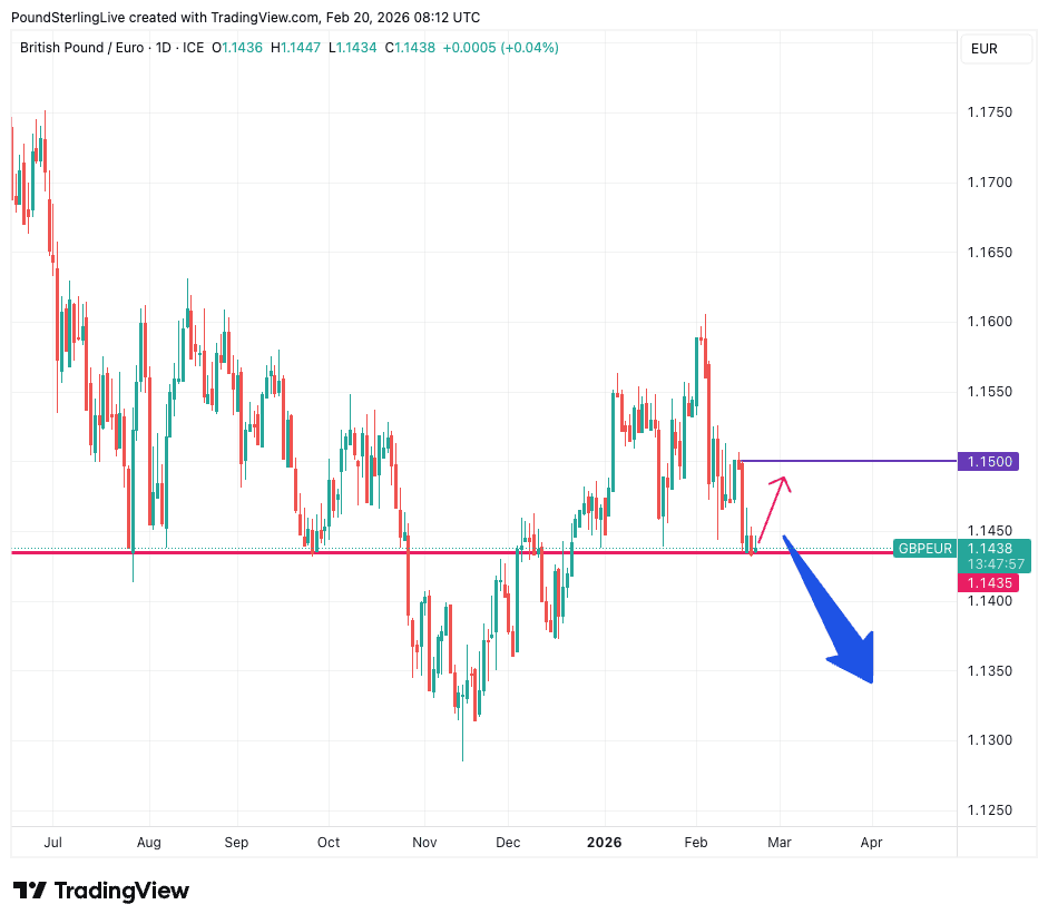 Above: GBP/EUR risks are heavily skewed lower, but some good data can help trigger a relief rally above 1.1435.